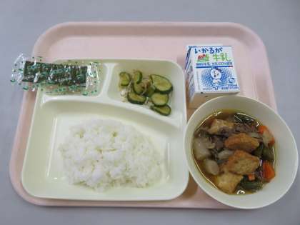・ごはん ・牛乳 ・牛肉と野菜のいため煮 ・きゅうりともやしのおひたし ・焼きのり