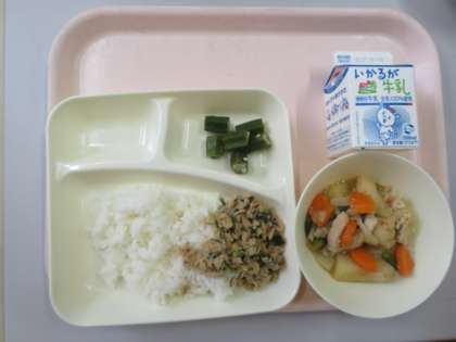 ・ごはん ・牛乳 ・鶏肉と一口がんもの煮もの ・オクラの梅風味 ・ツナっ葉いため