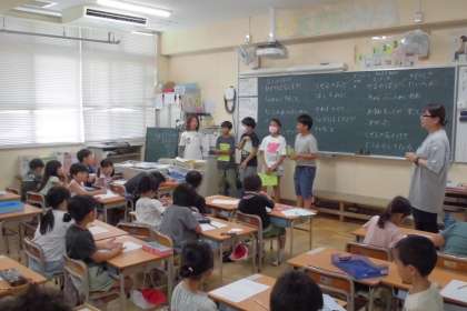 自然体験学習を終えた5年生が各学年の教室へ行って、高丸山の登山や魚つかみ、アスレチックなどについて話しました。