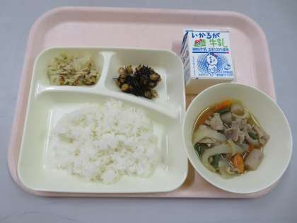 ・ごはん ・牛乳 ・豚肉と野菜の煮もの ・ひじき豆 ・ささみとキャベツのごまみそ焼き
