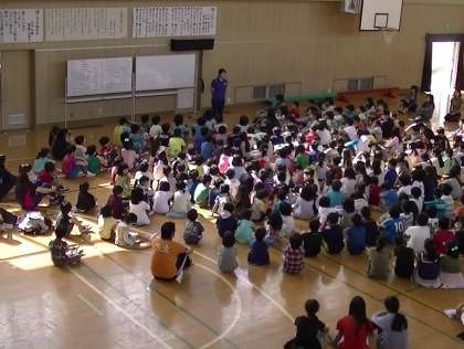 最初に校長先生からの話です。講堂に入ってから自分がしなければならないこと(音楽が鳴っている間の足踏み、座り方の3点セット)などの確認をしました。この休みの間、時間がたくさんあるので、普段はなかなか忙しくてできないことにチャレンジしてほしいということ、休みの間に全員が安全に元気に過ごしてほしいということについて話がありました。