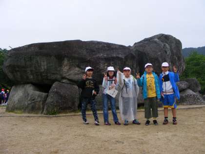 ゴールの石舞台古墳では、子どもたちは実際に目にする古墳の大きさに驚いたり、昔の人はどうやって石を積んだんだろうと疑問に思ったりしていました。