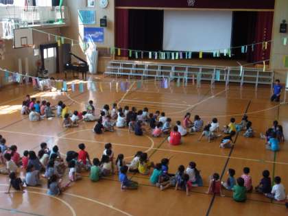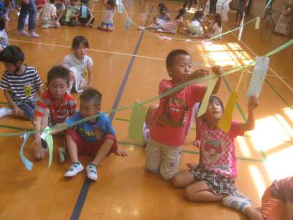 この日のために2年生は、司会、プログラムづくり、七夕の歌、ゲーム、紙しばい、はじめの言葉やおわりの言葉の各担当に分かれて七夕集会の準備を進めてきました。また、1年生といっしょに七夕かざりをつくり講堂中に、かざりました。