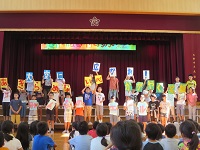 「このテーマはみんなの意見をもとに考えました。ひとりひとりが自分らしく自分の意志で最後まであきらめずに100%の力を出し切ろう。そしてこの思いやみんなの笑顔、みんなのエールが大空中に広がるように、こういう思いを込めています。みんなで大空ふれあい運動会をつくっていきましょう。」