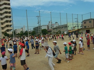 今日は、大空小学校を一緒につくっている地域のみなさんがスペシャルゲストとして来てくださいました。1〜6年生のふれあいグループに分かれて、3つの輪になった子どもたち。その輪の中に、踊りのボランティアのみなさん、サポーターのみなさん、地域のみなさん、教職員が入ります。明日も、みなさんとふれあう種目がありますのでぜひ、一緒にふれあい運動会をつくりましょう♪