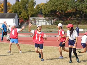 サッカーでは、各チーム作戦を立てていざ試合スタート!ゴールを目指して声をかけあい、攻めては守って、チーム一丸といった感じでみんなで楽しく、いや真剣なまなざしで、一つのボールを追いかけます。そして、こんな一面も…他のチームを応援していた違う学校の子どもたちがダンスで応援♪それを見た大空の子どもたちも、ダンスに参戦♪さらに、その学校の友だちとハイタッチ!!最高のふれあいです。