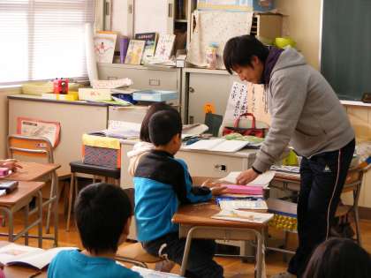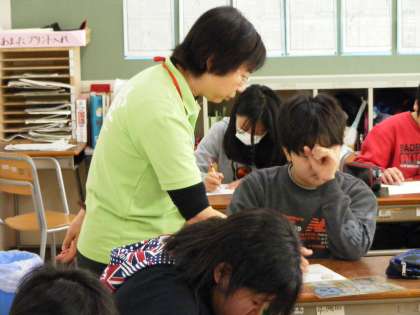先生たちもいつもと違うクラスなので、緊張しています。でも授業が終わったあとには子どもも先生も笑顔がいっぱいです。「先生ありがとう!また来てねー」「また来るな〜」と、どの教室からも聞こえてきました。