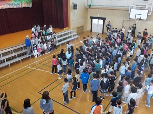 みんなが講堂に集まると、ピアノ演奏のBirthday songが流れ、誕生月の人がひな壇に上がります。うれしそうに行く子もいれば、照れながら行く子もいます。また、子どもたちだけでなく、サポーターや地域のみなさん、教職員も誕生月には主役になります!