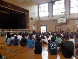 講堂に全員が集まった後、いのちを守る学習の担当教職員から子どもたち、地域・サポーターのみなさんに伝えます。