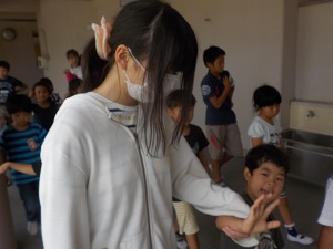 次は、津波を想定した訓練を行います。全員が4階に向かいます。1年生の子や困っている子が安心して行動できるように大空のリーダー(6年生)が案内したり、手を握ったりしながら、みんなが安全に避難することができました!