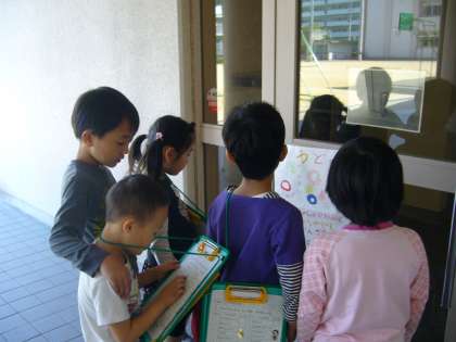 「しつれいしますって言うんやで。」「図工室はこっち。」「理科室は3年生になったら使うで。」2年生のやさしい言葉に、ギュッと手をつないで歩いている1年生。学校中の各部屋には2年生お手製の看板(説明付き)が貼ってあります。1年生はそれをゆっくり読みながら、次々と学校の中を回っていきました。