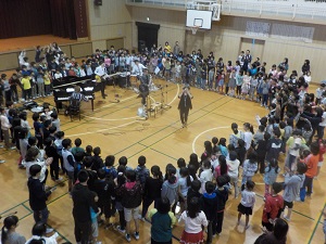 アンコール1曲目の「大空小学校校歌」をみんな一緒に歌いました。いつもの伴奏とは違う住吉ジャズバンドバージョンで、子どもたちは体を動かしながら楽しく歌っていました。