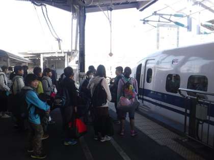 40名のリーダーは、朝早くから来てくれたサポーター・教職員に見送られながら広島に向けて出発します。朝からたくさんの人が乗っている地下鉄御堂筋線では、0の声(たとえ小さな声で話していても、その人数が多くなると周りの人に迷惑をかけてしまうから原則、喋らない)を守り、大きなカバンの持ち方を考えながら電車でのマナーを考えます。新幹線は、広島に向かう団体専用車に乗ります。いろいろな学校のお友達が乗ってきますが、なんと1号車は大空小の子どもたちだけです。車窓からわずかな時間だけ観える景色を当てたり、活動班のグループでお菓子を食べたり、トランプしたりと楽しんでいました♪