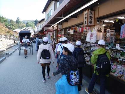 宮島では、世界遺産「厳島神社」を見学しながら探索していきます。観光客の中には、たくさんの外国のみなさんもいます。積極的に国際交流をしようとする姿が見られました。
