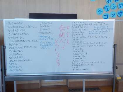 その中で、保田さんの話の中にあった「平和の反対は無関心」という言葉の「無関心」についてみんなで話し合いたいという考えが出ました。