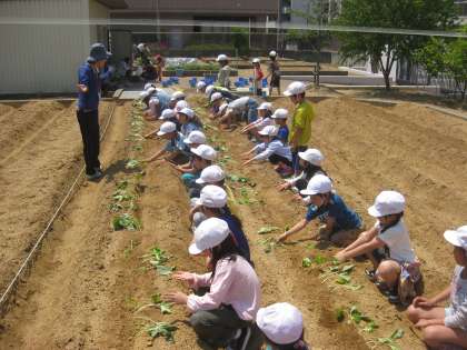 アシスタントティーチャーの久保田さんたちと一緒に、ミニトマトとさつまいもの苗を大空ファームに植えました。