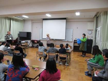 ・コラボ授業で宇宙人とアメリカ人というめずらしい組み合わせの2人が来ました。すぐこけちゃう宇宙人に便利なものをプレゼントしました。