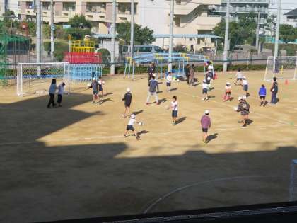 音楽が鳴り始めると、子どもたちは大空アップアップジャギーで身体を極限まで動かします!サポーターのみなさんも運動場に集まり、子どもたちと一緒にランニングをしたり子どもたちに声をかけたりしていました。