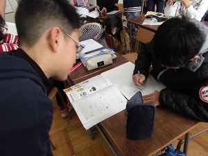 ・リーダーと一緒に「じゃんけんやさん」の学習をしました。とっても楽しかったです。中学生になっても元気でいてね。