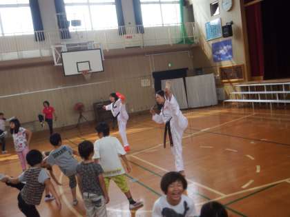 まずは、大きな声でのあいさつや気合の「ヤー!」から始まり、基本的な動きから、大きく足を振り上げる動きまで、大空のみんなでテコンドーの動きを楽しみました。