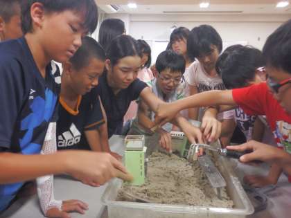 次に地震のメカニズムを模型を使って体験しました。自分たちが組み立てた家や道路が簡単に崩れてしまったり、地震が起きたあとの地表の様子を観察したりできました。