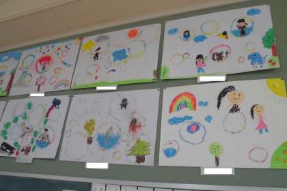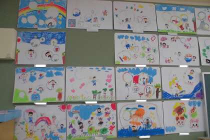 指でこすって描いたシャボン玉の中に、自分のすきなものを描きました。