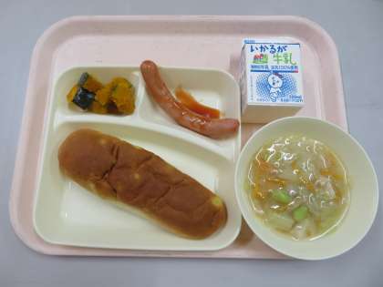 ・おさつパン ・牛乳 ・ウインナーのケチャップソース ・スープ ・焼きかぼちゃ
