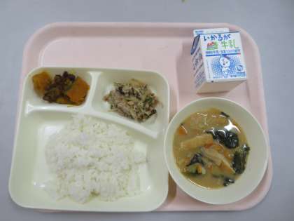 ・ごはん ・牛乳 ・豚肉の甘辛焼き ・みそ汁 ・かぼちゃのいとこ煮