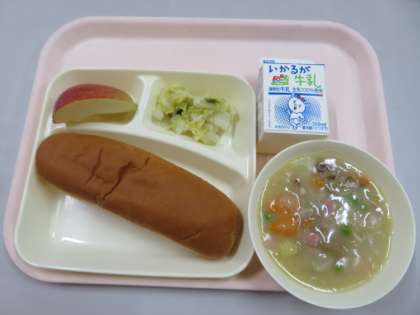 ・黒糖パン ・牛乳 ・鶏肉とさつまいものシチュー ・はくさいのピクルス ・りんご