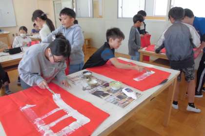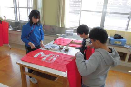 運動会の演技で使用する法被に自分たちの一文字を描きました。