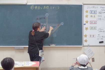 三角定規を2つ使って、一つの直線に垂直に交わる直線を書く学習をしました。