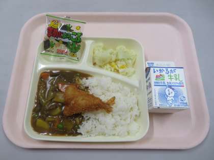 ・えびフライカレーライス ・牛乳 ・カリフラワーのピクルス ・豆こんぶ