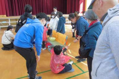 1,2年生が「どんぐりごま」や「どんぐりめいろ」、「どんぐりけん玉」などを手作りして、お店を出しました。
