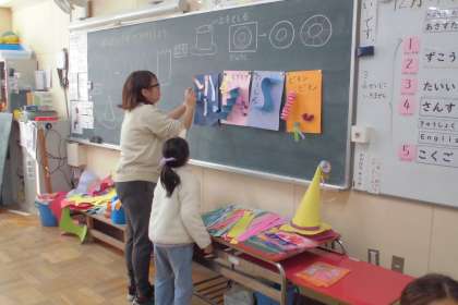 細い色画用紙を巻いたり、折ったりしながら、立体的に飾りをつけていました。