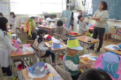 いろんな色の色画用紙を使って、自分だけの帽子を作っていました。