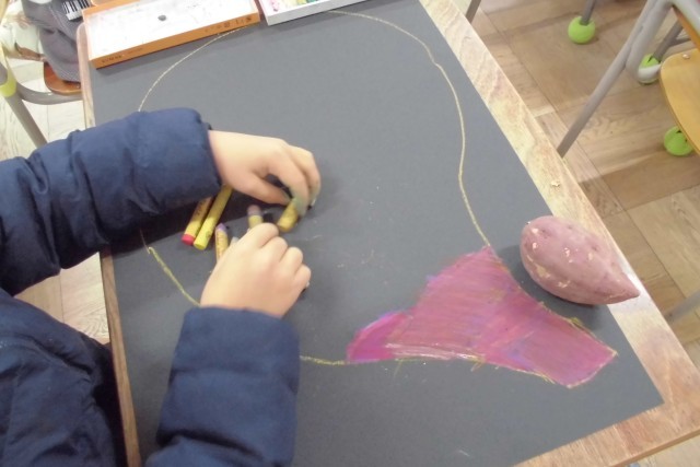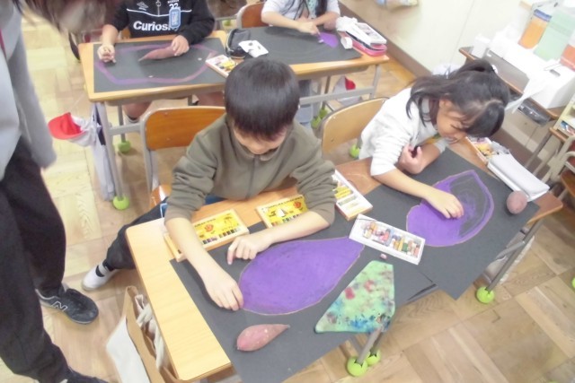 「よく見てかこう」をテーマに、さつまいもを描きました。