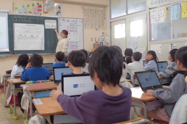 自分でつくった4拍のリズムを「おさるのだいくさん」の歌に合わせてたたきました。