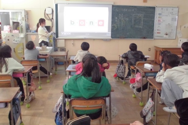 アルファベットの音を、一つ一つつないで単語を言う学習をしていました。