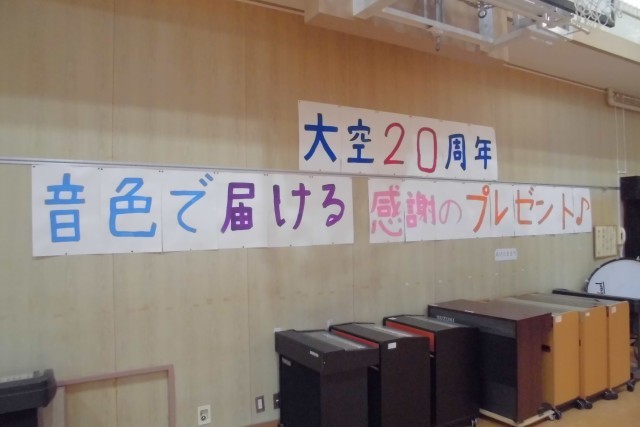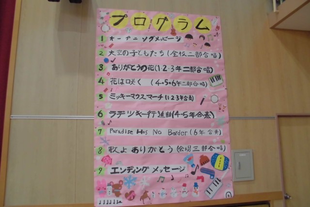 子どもたちが描いた意気込みの紙や、テーマ、大看板などたくさんの飾りが掲示されました。