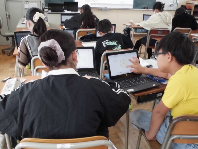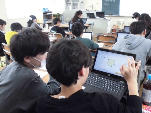 タブレットを使って、対称の軸を書いて折り曲げたり、回転させたりして調べていました。