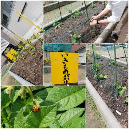 今年は、キュウリ、ピーマン、ナスを育てています。撮影中にテントウムシを見つけました。ジャガイモの葉に乗っていました。