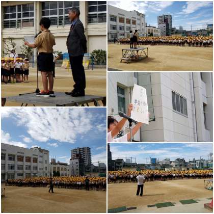 今日は「毎日小学生新聞」に載った詩の紹介がありました。作者の5年生の男の子に指揮台の上で読んでもらいました。この詩は校長室の前に掲示しています。来校の折に読んでみてください。
