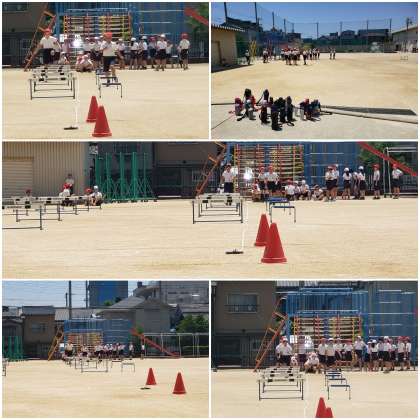 暑くなりました。運動場では水分補給をすぐできるよう水筒を運動場へ持ち出しハードル走を行いました。今回はまず、ハードルを置いていないレーンを何秒で走れるかを測り、次にハードルを置いたレーンを何秒で走れるかを測りました。その差が小さいほど、うまくハードルを跨いで走れているということになります。