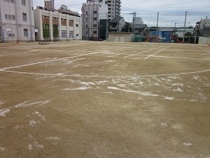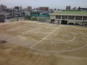 9月19日(金)の放課後、教職員の作業で、運動場のにがりまきを行いました。にがりは、運動場の土を固くしめて、砂埃が舞うのを防止する効果があります。50袋のにがりを手作業でまきました。写真で白く見える部分はにがりが残っている部分です。水をまくと溶けて徐々に運動場にしみ込んでいきます。