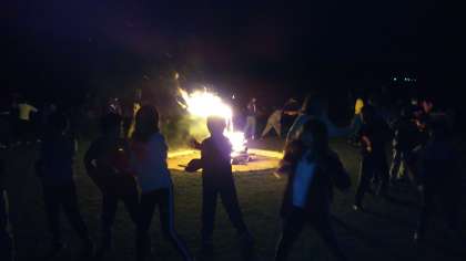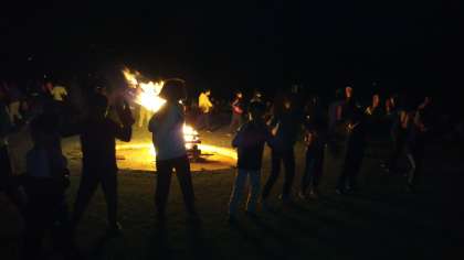 キャンプファイヤーは、火の神様が鉢伏山から降りてこられました。4人の火の子に信頼の火、友情の火、意志の火、希望の火を分けてくださいました。5年生のみんなの絆がさらに深められるようにと、係の人を中心にしっかり準備してきた成果を充分発揮しました。また、各クラスごとのスタンツもあり、大いに盛り上がりました。