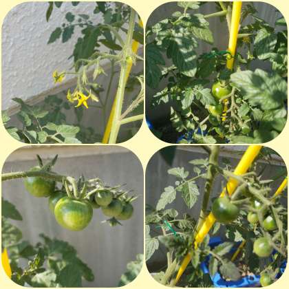 2年生が育てているミニトマト、黄色い花が青い実に生ってきました。