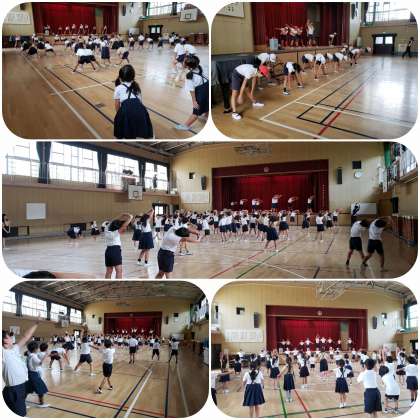 運動会で行うラジオ体操と終わりの体操の練習をしました。たくさんの人が集まりました。運動委員会の人たちがいい見本となりました。