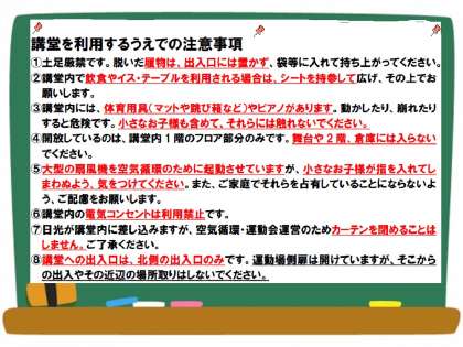 運動会当日、講堂をご利用いただく上での注意事項を講堂入口に掲示しておりますので、ご覧いただきご利用ください。ホームページの《配付文書》にも掲載しております。