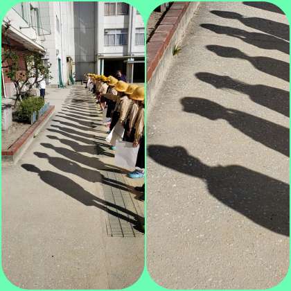 太陽の学習をしています。その日の時刻によって太陽の光でできる影の長さや、向きの違いについて学習しています。