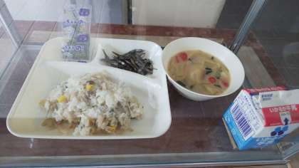 「れんこんのちらしずし、ぞうに、ごまめ、牛乳」
